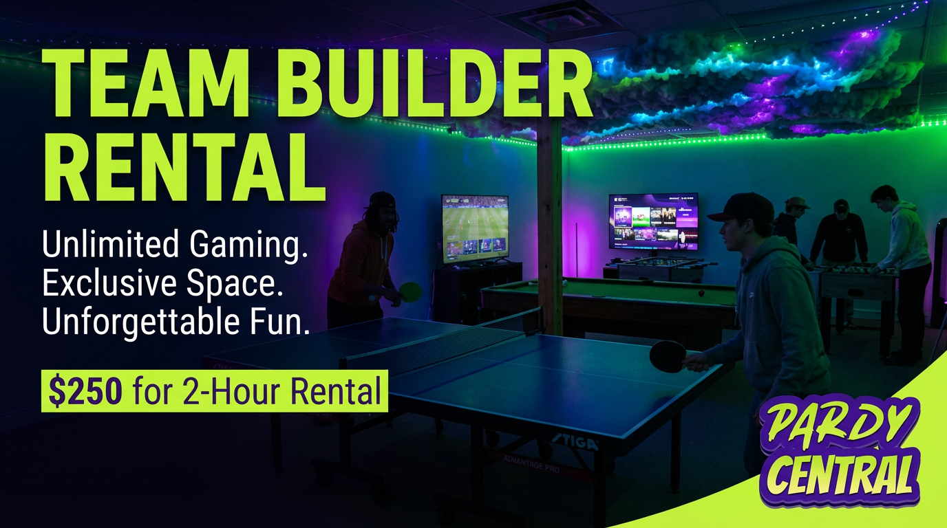 Pardy Central is your ultimate destination for limitless entertainment and exclusive access to a diverse array of experiences. With unlimited play, visitors gain exclusive entry to all 10 Pardy Central rooms, featuring cutting-edge gaming consoles like Play Station 5, Xbox Series X, and the Nintendo Switch, as well as immersive VR rooms. In addition to gaming, our rec room is equipped with activities like pool, ping pong, foosball, and more, ensuring non-stop fun for all. When it’s time to take a break we have our dedicated party room, complete with a kitchen boasting a fridge, stove, and microwave. Plus, stay connected with free 1GB Wi-Fi, making Pardy Central the ultimate hub for unforgettable gatherings and celebrations.